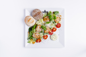 3. Sałaty z łososiem grillowanym, sos miodowo-musztardowy