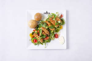 1.Sałaty z falafelami z batata, chrupiącymi warzywami, sos miętowy